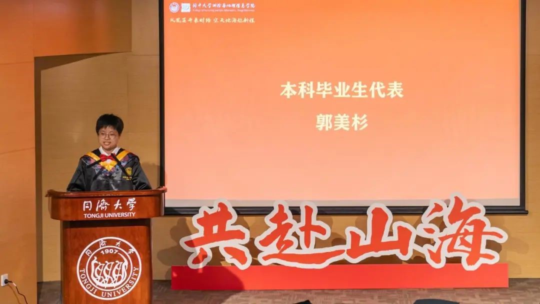本科毕业生代表郭美杉发言。她回忆起与同学们相处的难忘时光,表示“青春的旅途从来没有标准的航线,面对选择,每个人都有不同的答案。”大学教会她对无数次的选择做“减法”,选择对国家与社会有价值的事,选择更难的路,选择做自己喜欢的事,才能不知疲惫地坚持下去,在时间的回响声中收获踏实的成长。最后,她祝愿大家都能在当下的生活感悟生命的美好,在纷乱的世界中坚守原则,成长为自己所热爱的模样。