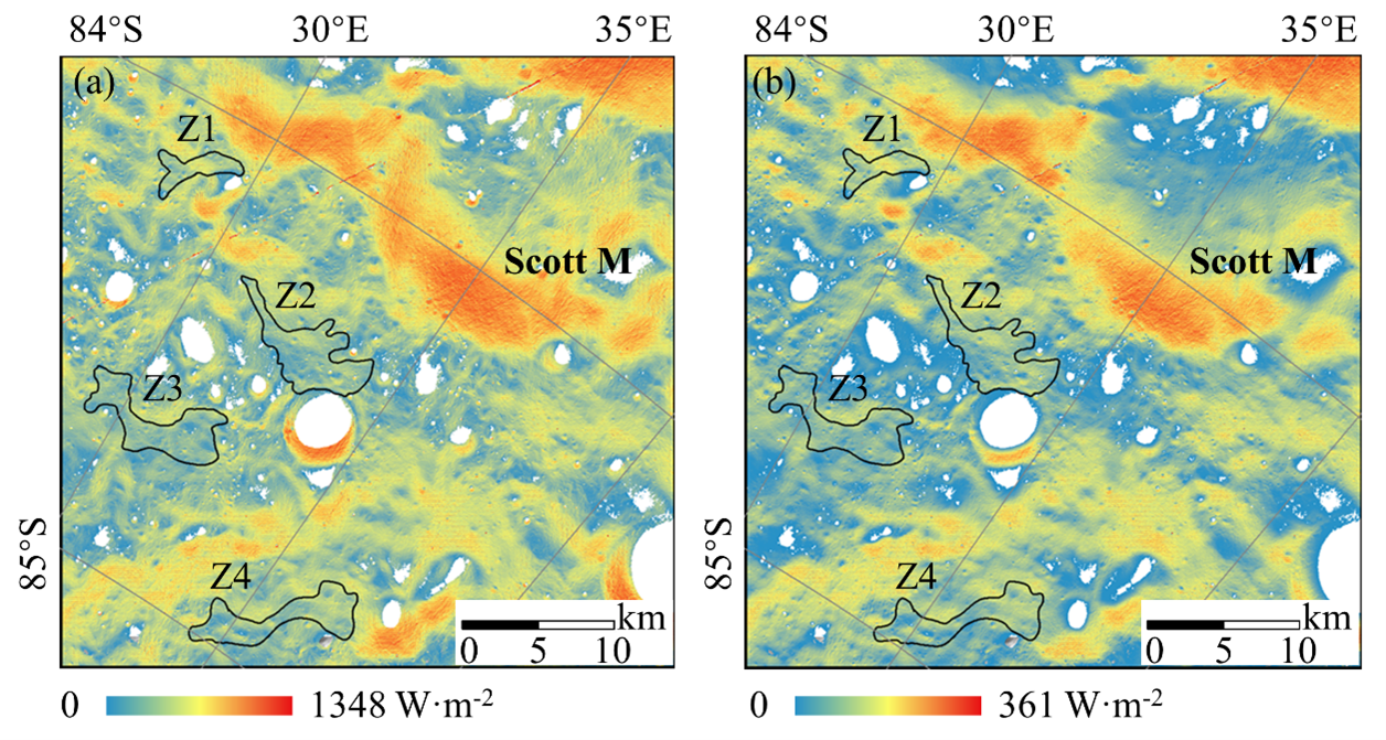 月球南极Scott M区域实时太阳辐射年最大值与年均值