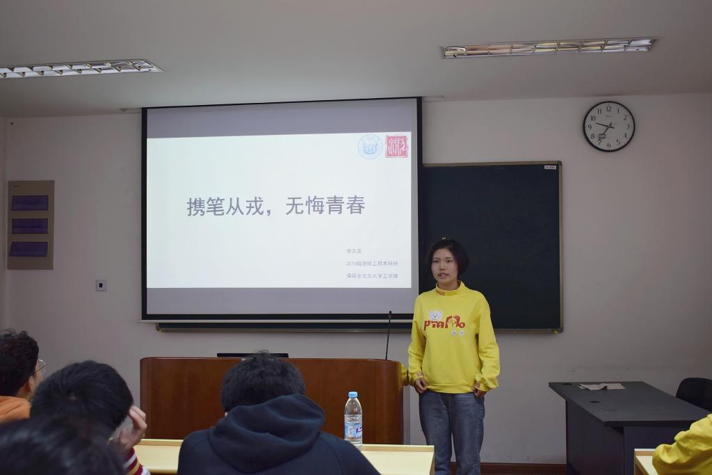 着一身戎装,展飒爽英姿。2015年9月,在完成了第一学年的学业后,李庆美满怀着对军营生活的向往和憧憬,奔赴酒泉卫星发射中心。当兵并非她一时冲动,自儿时起,她的心中就已埋下一颗参军报国的种子。当看到学校武装部发布的征集大学生新兵的海报时,心底的那个梦想重又燃起。“青春总要有点不一样!”她说。