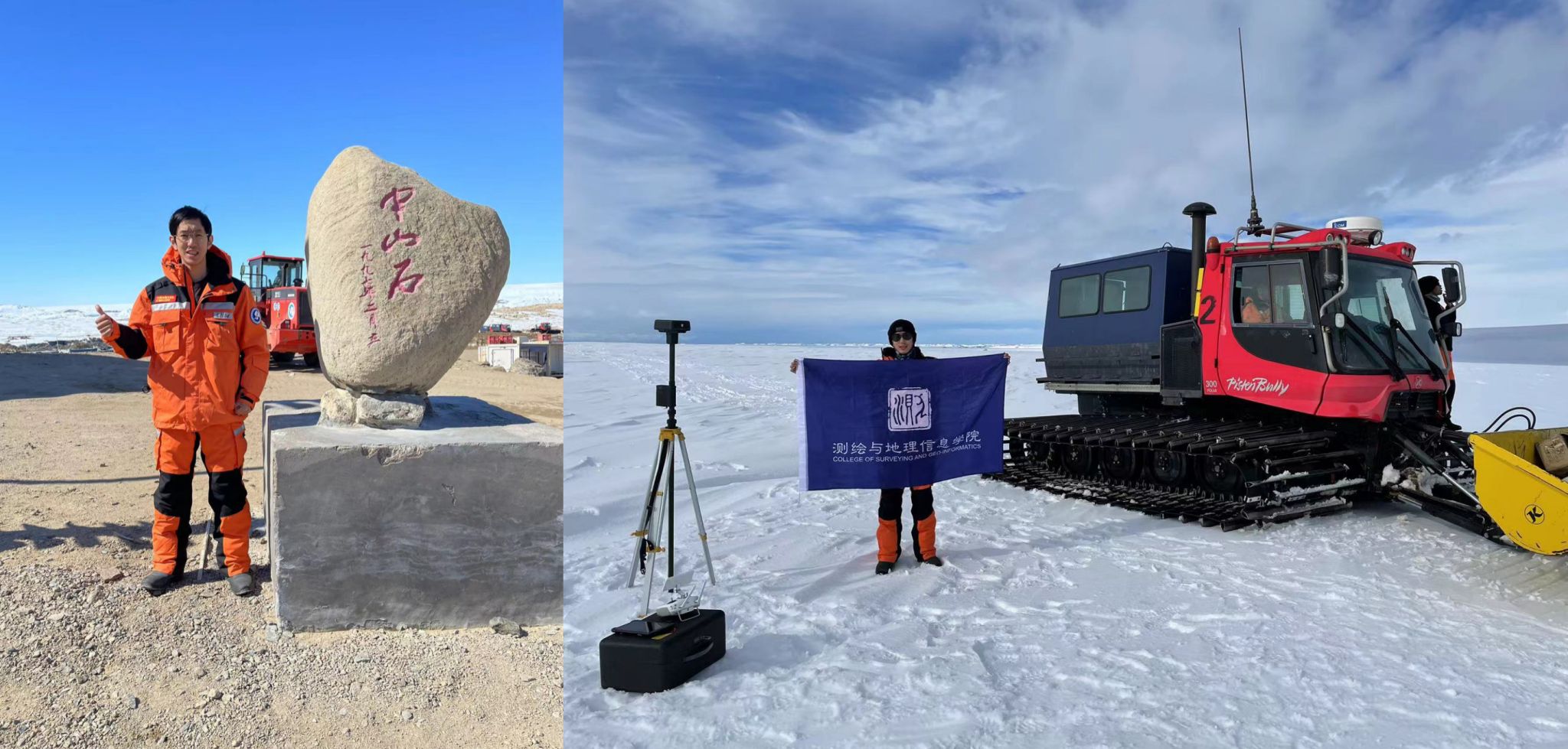 4)博士生谢陈雨参加中国第40次南极科学考察 博士生谢陈雨于2023-2024年间参加中国第40次南极科学考察,作为首位“00后”内陆队员,前往南极内陆格罗夫山地区,针对物质平衡关键参数及冰雪表面特征进行高精度测绘研究。考察期间,开展高精度无人机航空摄影测量,联合全波段地面光谱仪与光学卫星及无人机同步测定冰雪表面光谱曲线,通过地面及低空冰雷达探测冰雪浅层结构特征,基于高精度GNSS测量冰雪表面三维坐标等科学研究。基于国产高分辨率遥感卫星数据对格罗夫山地区行进路线以及麒麟冰下湖探路选线提供技术支持,为考察队安全行进做出了贡献。