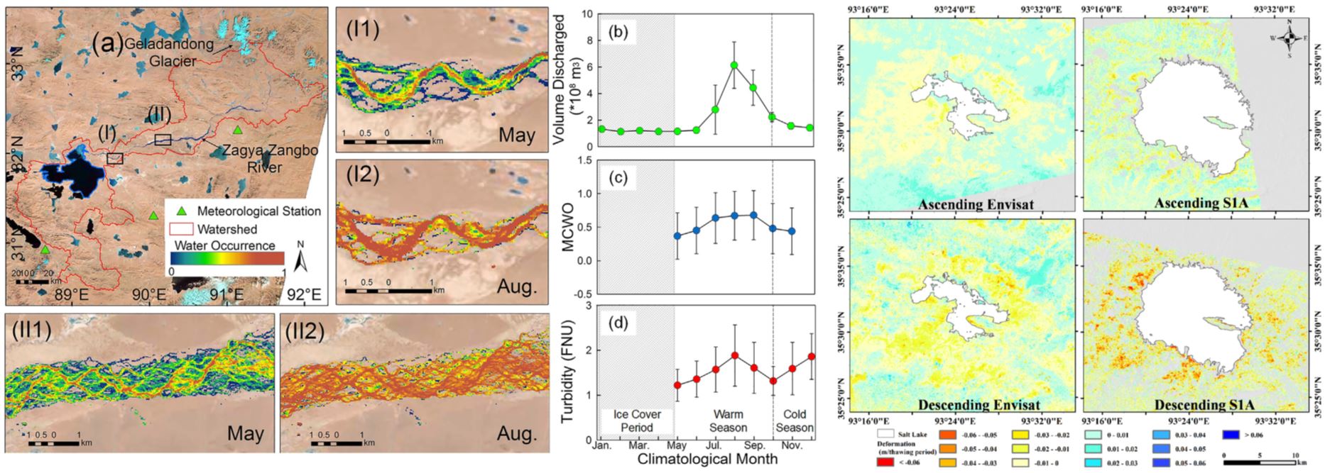 4. 青藏高原湖泊遥感与全球变化研究:探明了青藏高原大型湖泊水质变化特征及其驱动机制,揭示了湖泊持续扩张对于永久冻土退化的加速作用及对气候变化的脆弱性响应;成果发表于Remote Sensing of Environment和Science of the Total Environment等国际期刊。
